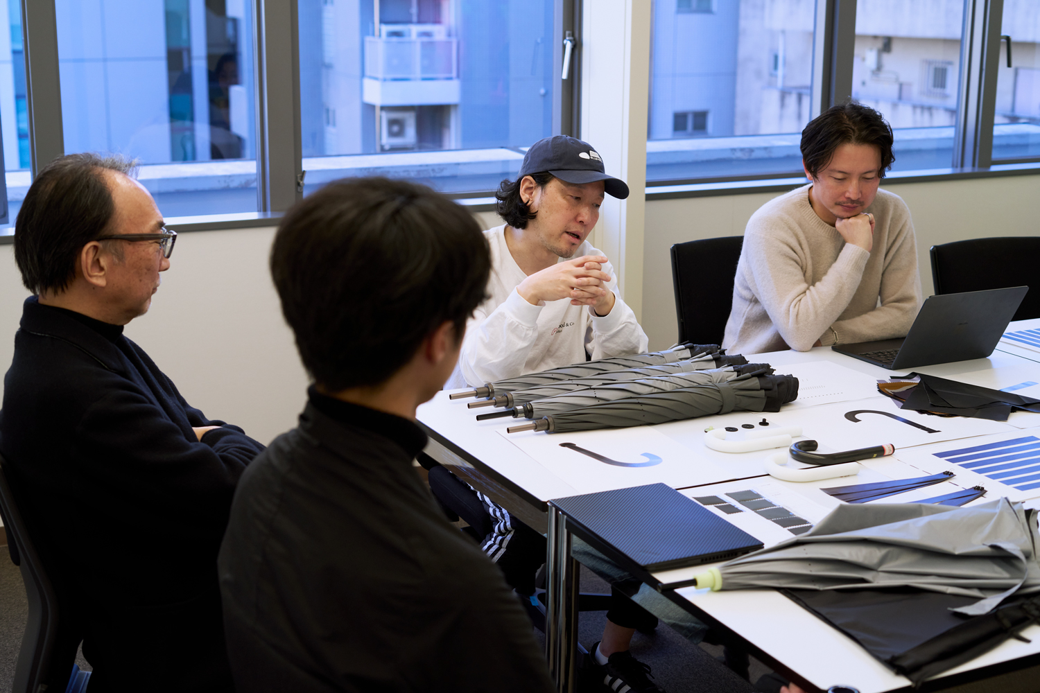 最新技術と構造を掛け合わせ、「最高の雨傘」として生まれ変わった「SAKASANANO」。ウォーターフロント代表取締役の吉野哲、プロジェクトリーダーの大島裕貴、クリエイティブディレクターの石黒篤史さん、プロダクトデザイナーの角田陽太さんの4人は、2023年からリニューアルプロジェクトを進めてきました。